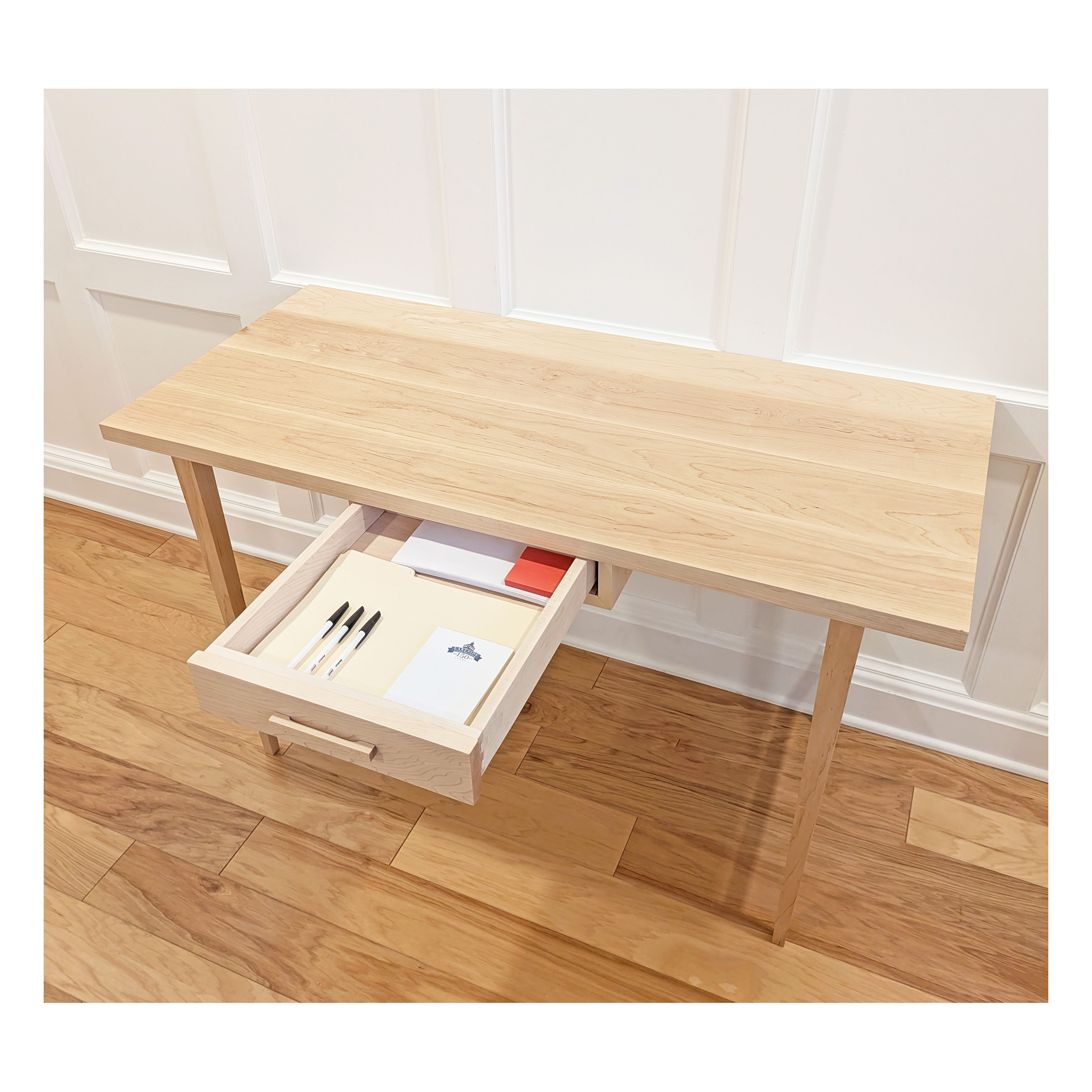 This is a nicely made desk perfect in size for a corner in our bedroom. I typically use it with my laptop and for that the desktop area is just right. The drawer is not terribly deep so besides some pens, post-its and envelopes it really can not hold anything more than about 2 1/2″ in height. Though it is self-closing which is nice. The salesperson who I talked with on the phone was knowledgably and very polite. Great experience!