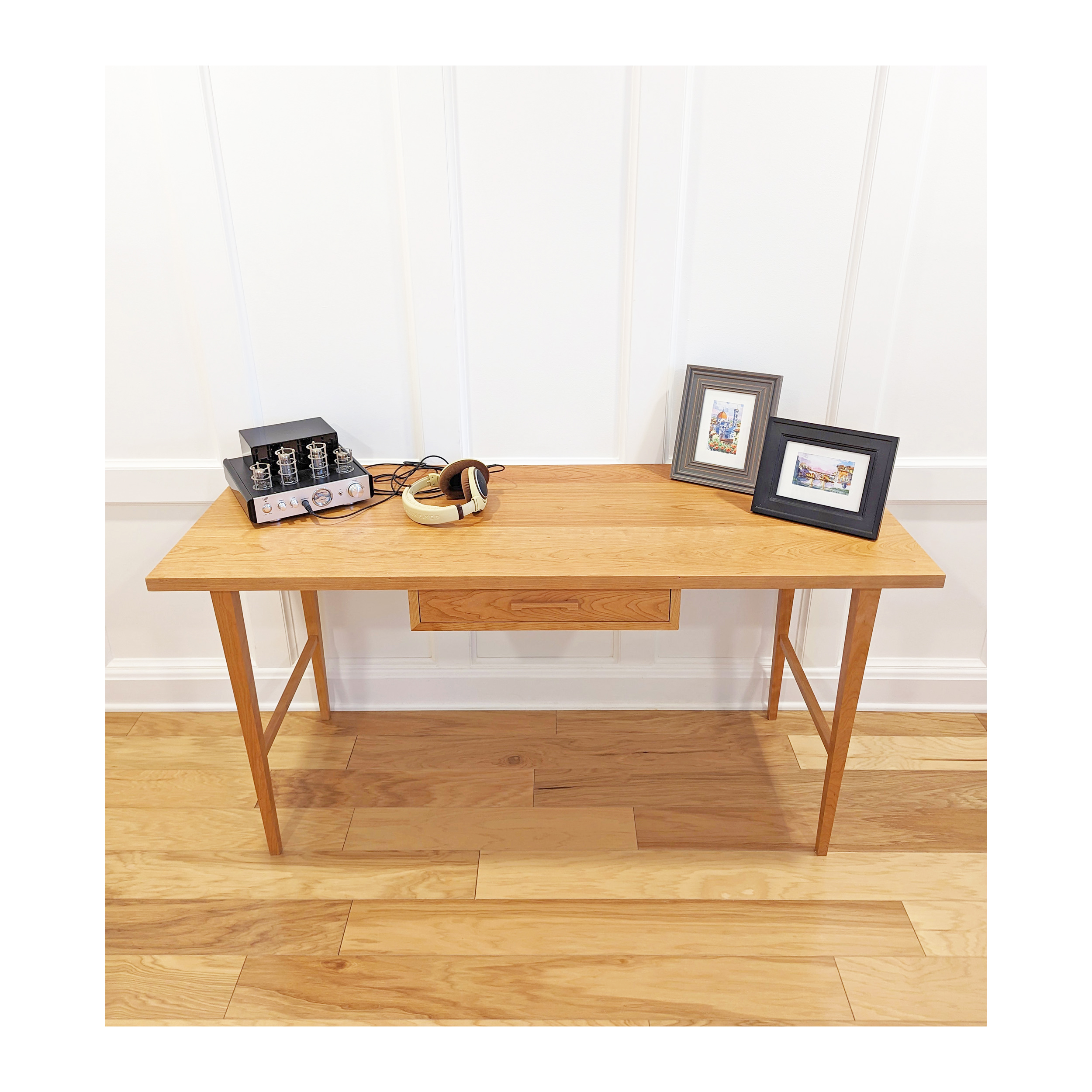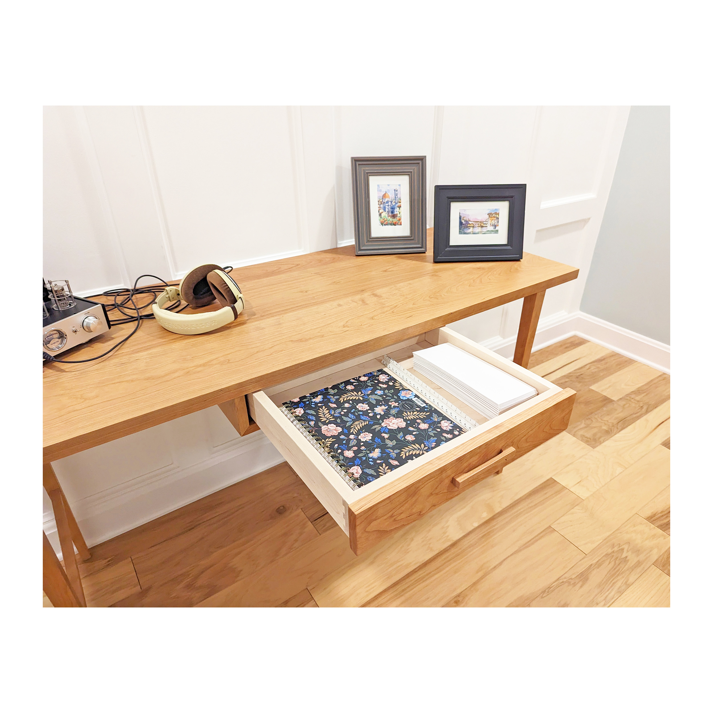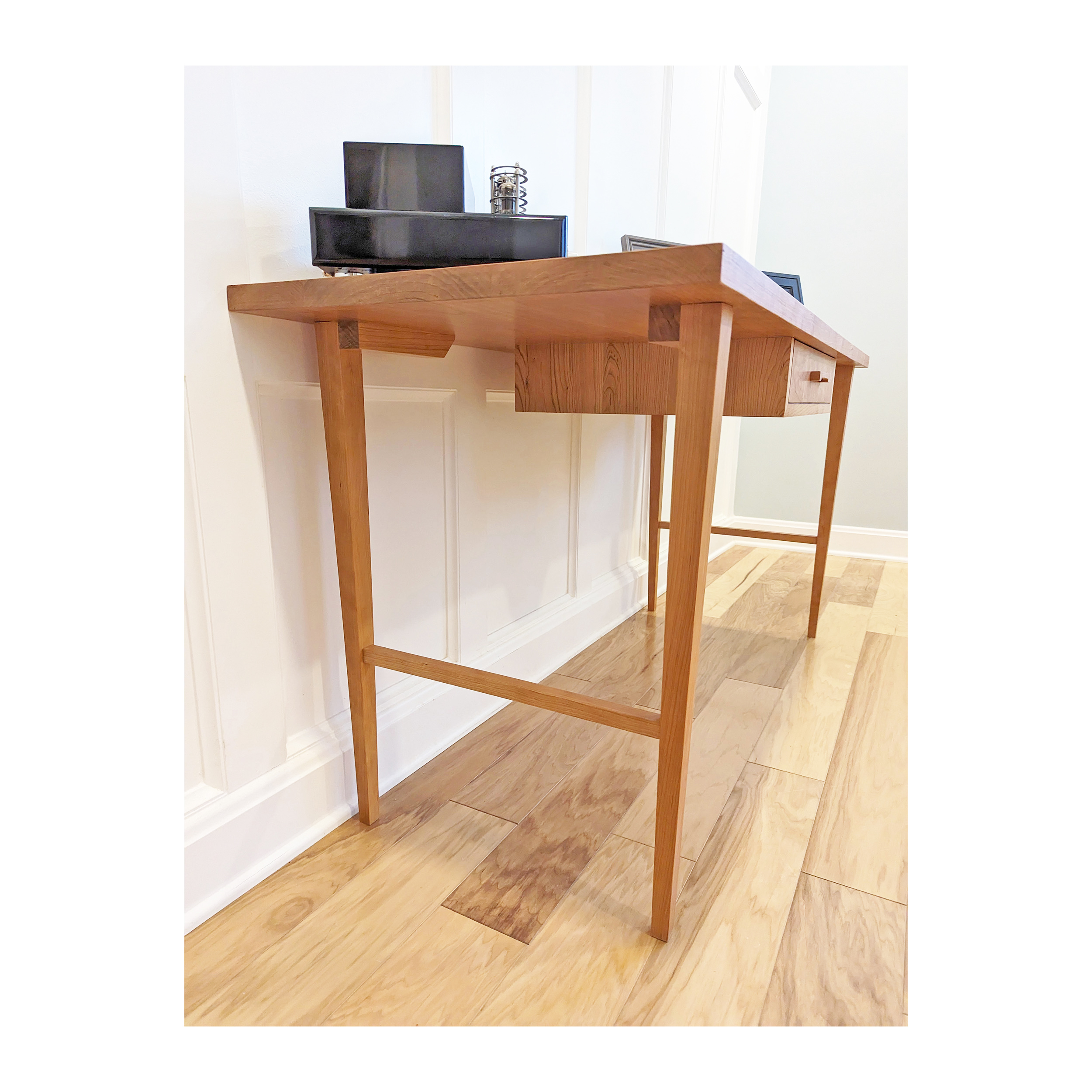 I enjoy the interesting and modern design on this desk. Since the standard top size was a little narrow for what I needed, they built me a desk about 5 inches deeper. The drawer handle made out of wood is clever. The drawer is not super large but holds what I need it to. Overall, a nice addition to my home.