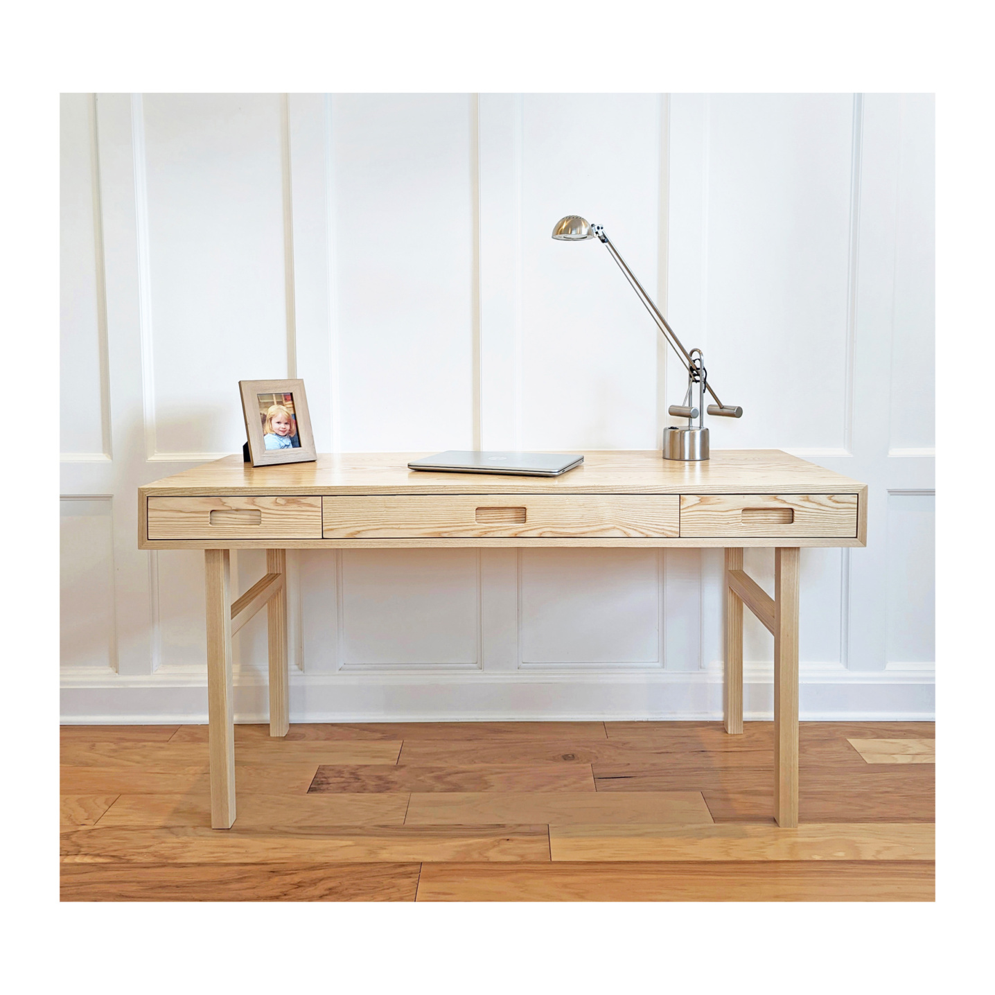Our Tre line of desks takes their name from the desk’s three drawers. Each drawer has its handle cut directly into the wooden drawer front. The desk top is solid wood with wood planks that carefully are fastened together with mitered corners. A simple yet very versatile desk.